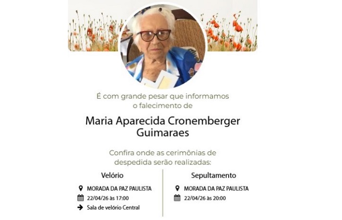 O Velório da senhora Maria Aparecida Cronemberger, de 95 anos, está sendo realizado no Velatório Morada da Paz, em Paulista – Pernambuco e o sepultamento acontece no mesmo velatório, nesta quinta-feira (23).